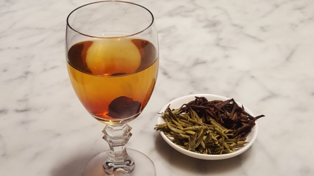 获胜的方法是分别在不同的温度和时间沏两种茶。然后斯泰西将它们混合在一起,加入视觉上的潘趣和酸樱桃的酸甜风味,最后倒入陈年的雪利酒杯中。