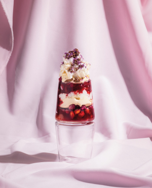 - 将一半大黄倒入碗底或6个罐子里,涂上一半的奶油混合物,把一半的蛋白霜弄碎放在上面。重复以上步骤,用玫瑰花瓣装饰。